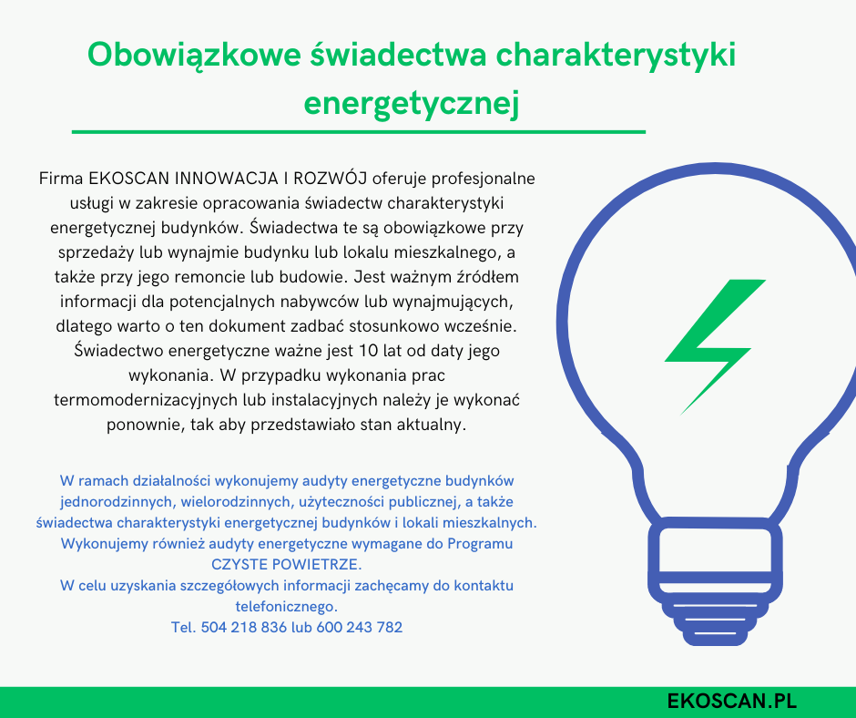 Tak, spółka EKOSCAN INNOWACJA I ROZWÓJ SP. Z O.O. wykonuje świadectwa charakterystyki energetycznej dla różnego rodzaju budynków i lokali, w tym dla budynków i lokali wspólnot, budynków komunalnych, użytkowych oraz mieszkalnych. Wykonanie świadectwa jest niezwykle istotne, aby właściciele nieruchomości mogli poprawić ich efektywność energetyczną oraz obniżyć koszty związane z zużyciem energii.